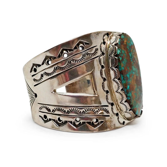 This vintage Silver Arrow Native American cuff pays tribute to the tribal stamp work style popularized during the Fred Harvey Era (circa 1920s–1940s). While echoing early aesthetics of Navajo jewelry, the bracelet’s thick-gauge silver, substantial construction, and patina suggest it was crafted post-Harvey Era, likely in the 1960s or 70s, when Navajo silversmiths began emphasizing artistry over tourist production. A striking natural teal turquoise stone is framed by intricate raised silver appliqué, blending traditional design with the bohemian style of the time—a unique and collectible piece for any Southwestern jewelry enthusiast.