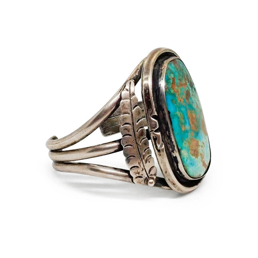 This striking vintage Navajo cuff bracelet features a bold, natural Royston turquoise stone set in a handcrafted sterling silver setting. The high-grade turquoise displays a captivating blend of vibrant blue-green hues and a rich golden brown matrix, reminiscent of the desert landscapes of the American Southwest. The bezel-set stone rests on a split-shank band adorned with feather appliques—symbols of spiritual connection, honor, wisdom, strength, and freedom.