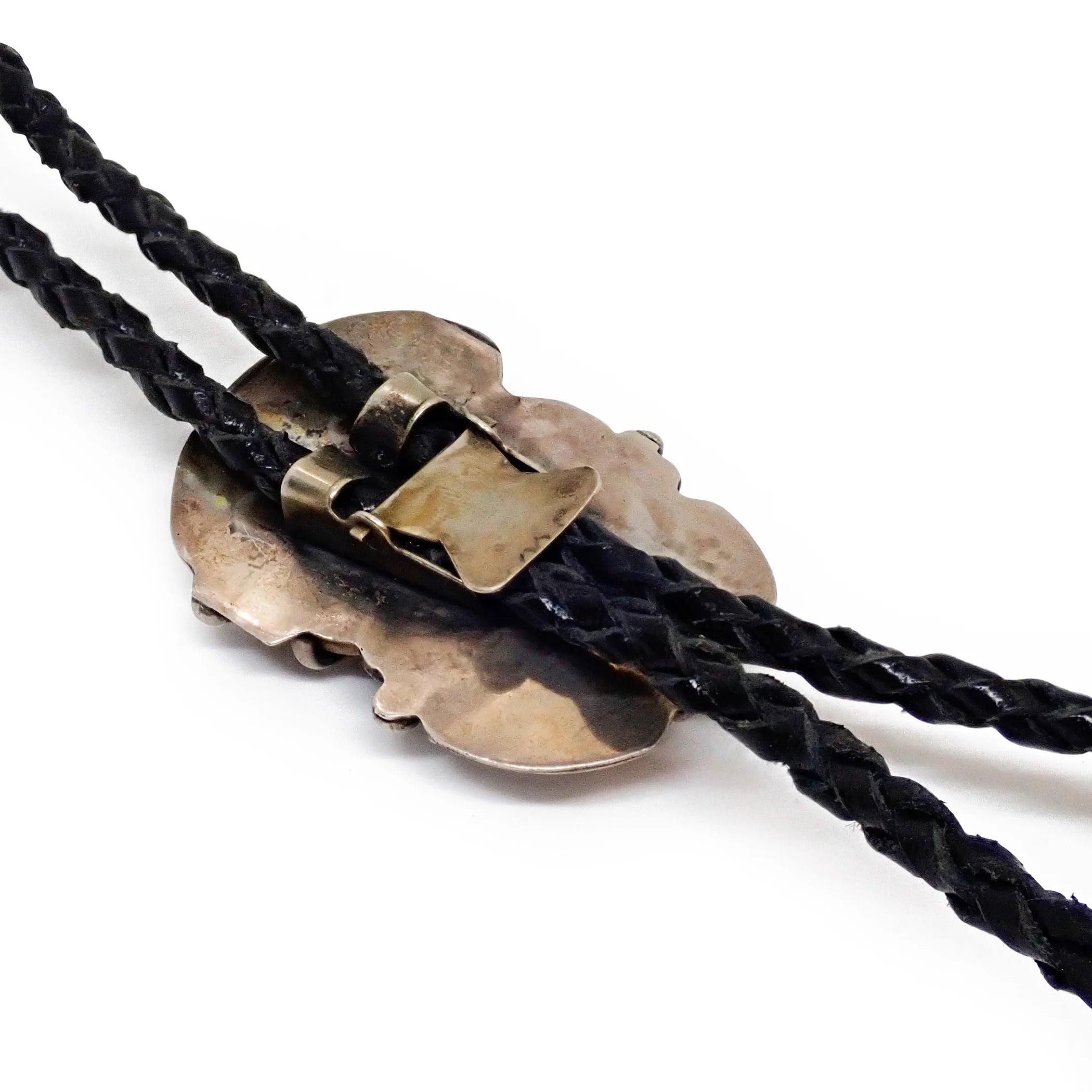 Finished with a black braided leather cord and silver tips, this bolo tie carries a strong sense of identity and heritage—an expressive vintage piece for collectors drawn to thoughtful design honoring Navajo and Western traditions, turquoise-and-claw pairing, and enduring craftsmanship.