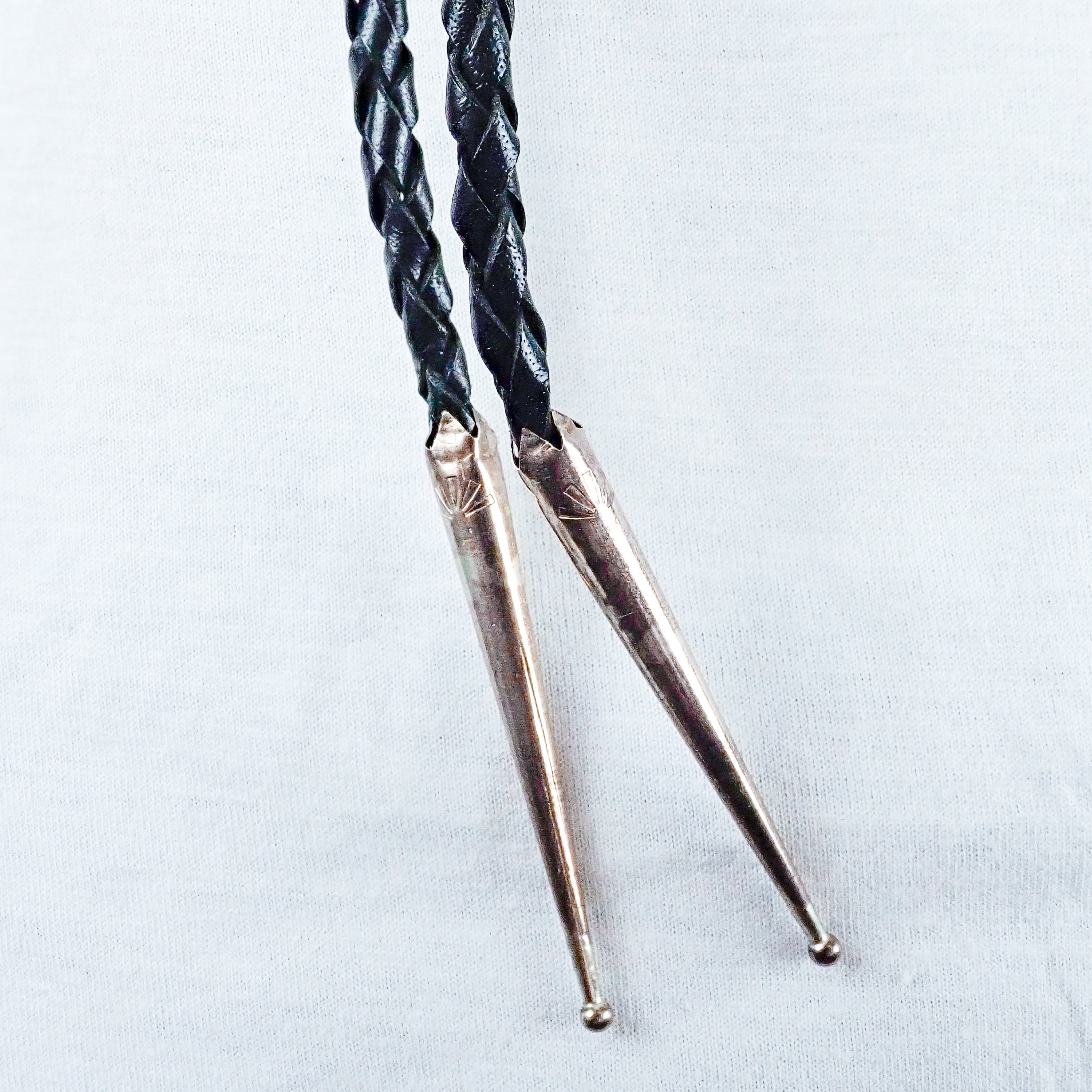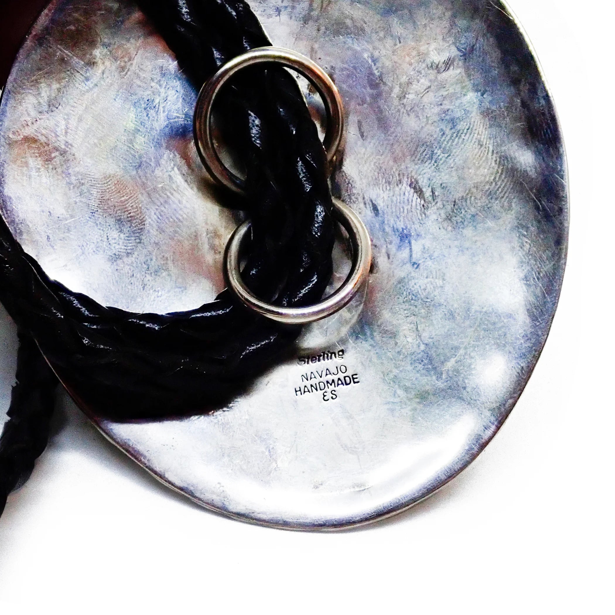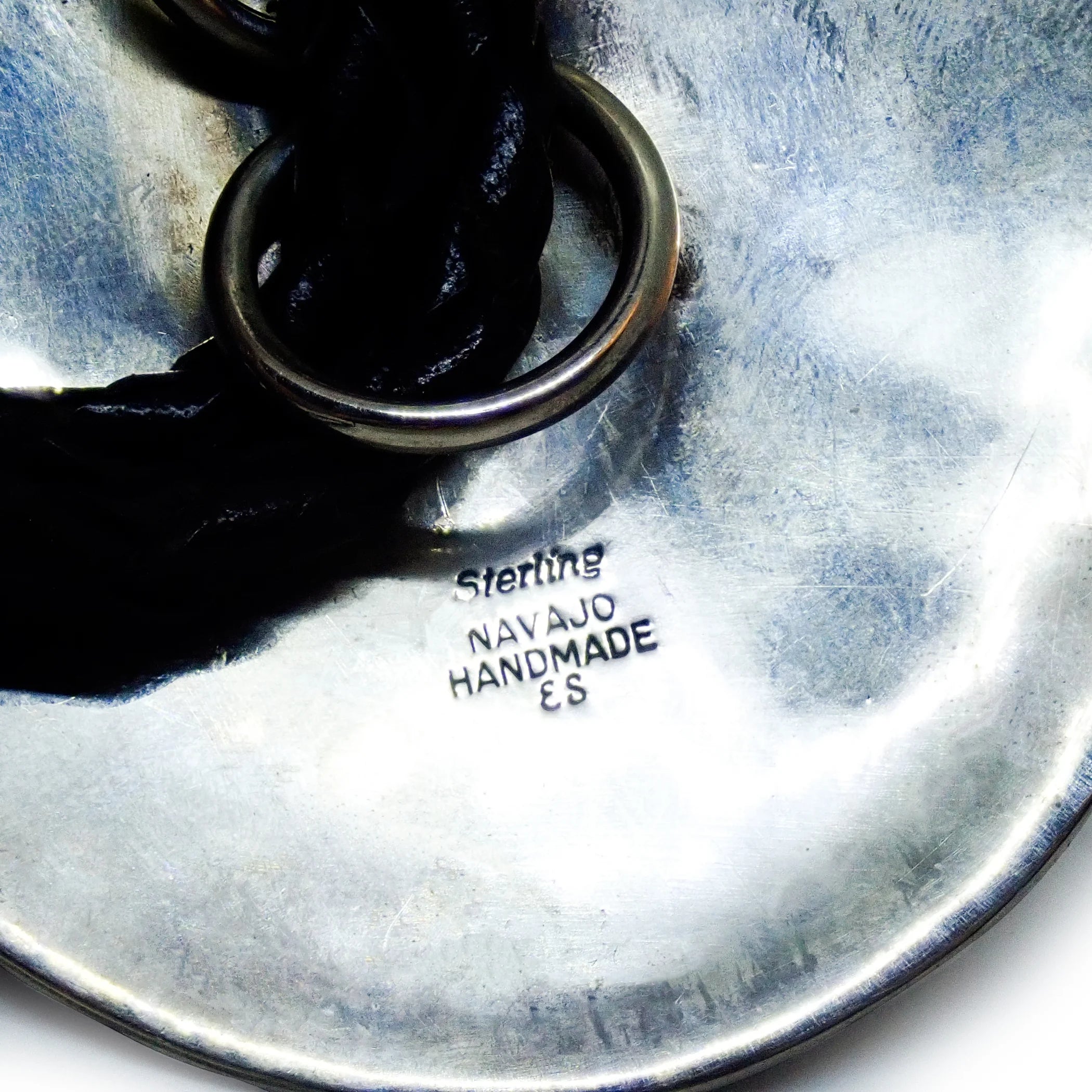 Finished with a classic black braided leather cord and silver tips, this piece exemplifies Elaine Sam’s confident approach to form, symbolism, and wearability. It stands as a strong representative example of her later work and her enduring contribution to contemporary Navajo jewelry—an authentic, collectible piece valued for craftsmanship, material integrity, and cultural resonance.